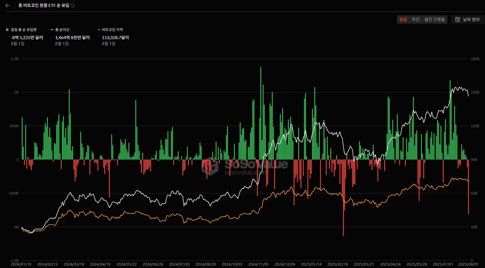 • BTC ETF 순유입: -8125만 달러 (8월 1일 기준)