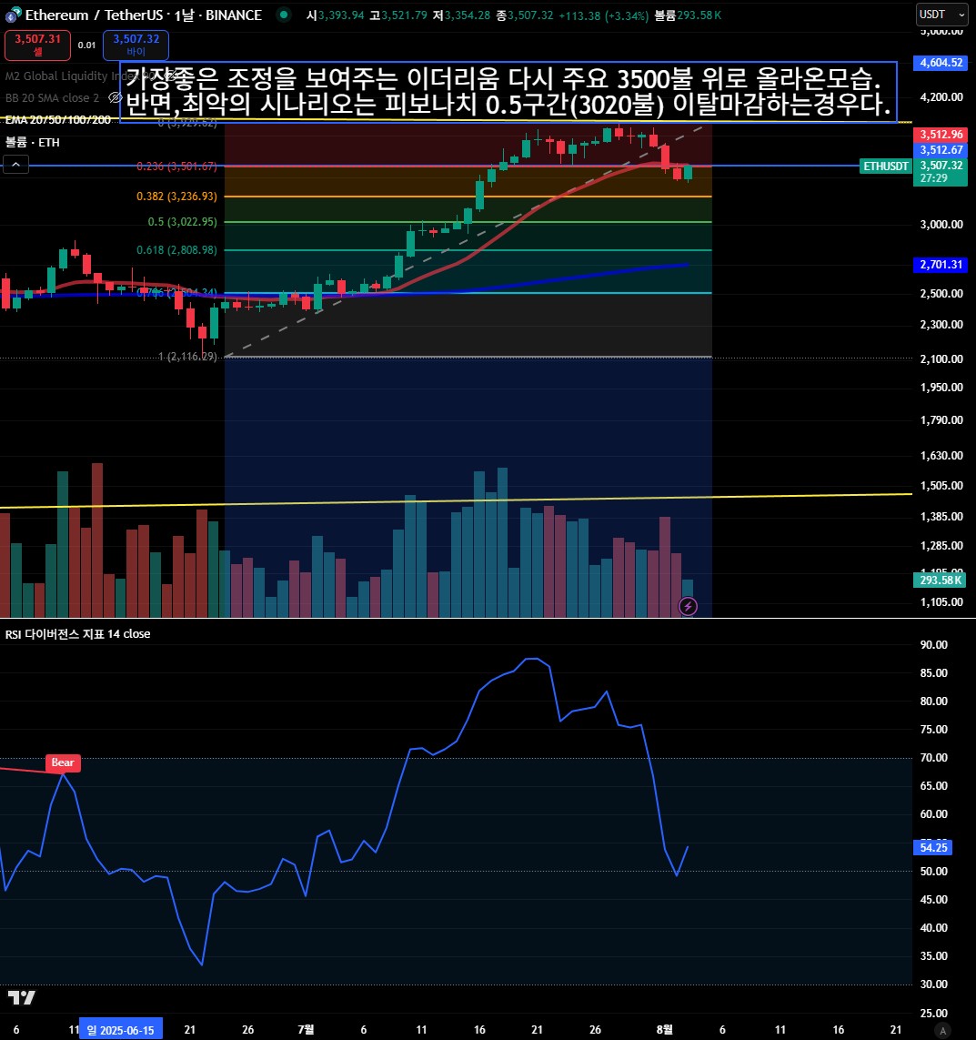 3500불 지지선이 유지될 경우, ETH는 BTC보다 우세한 흐름을 이어갈 수 있습니다. 다만, 3020불 피보나치 0.5 지지선이 무너질 경우엔 기술적 중기 하락 사이클로 전환될 수 있으므로 유의해야 합니다.