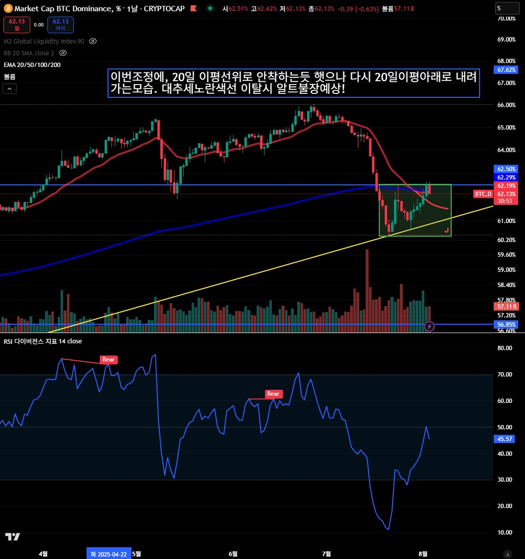 비트코인 도미넌스는 최근 20일 이동평균선을 돌파하려는 시도를 했으나, 종가 기준으로는 지지받지 못하고 다시 하방으로 꺾인 모습입니다. 이 흐름은 중기적으로 BTC 중심의 상승 흐름에서 알트코인 순환구간으로 전환될 수 있음을 시사합니다.