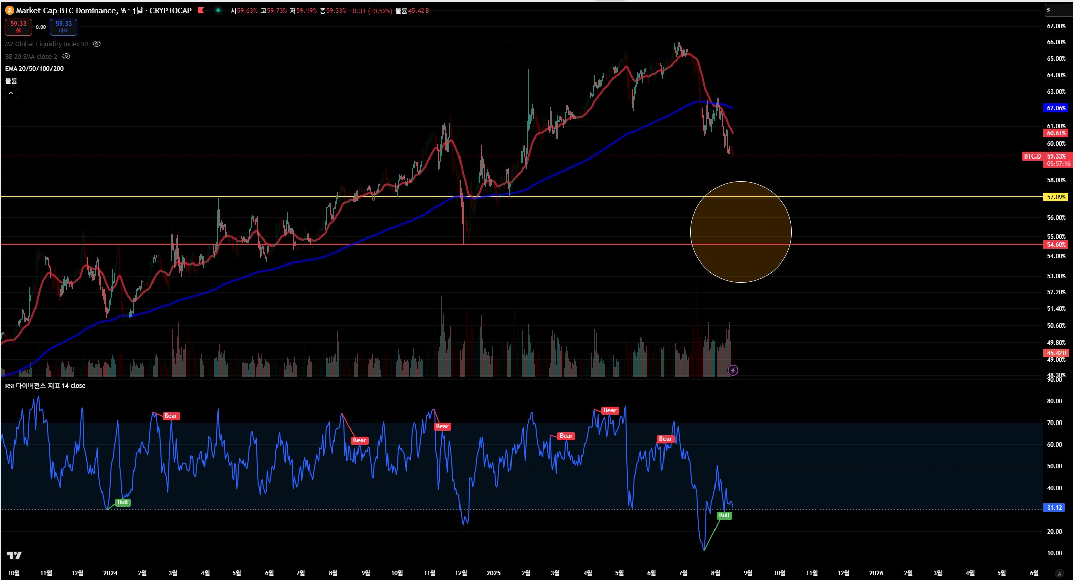 • 57% 부근 횡보 시작 → 알트 불장 개시 신호