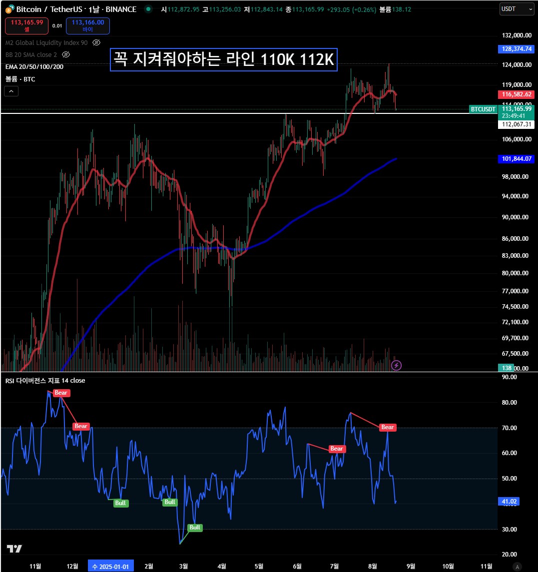 즉, 단기적으로는 112K와 110K 지지 라인 방어 여부가 시장 심리를 좌우할 전망입니다.