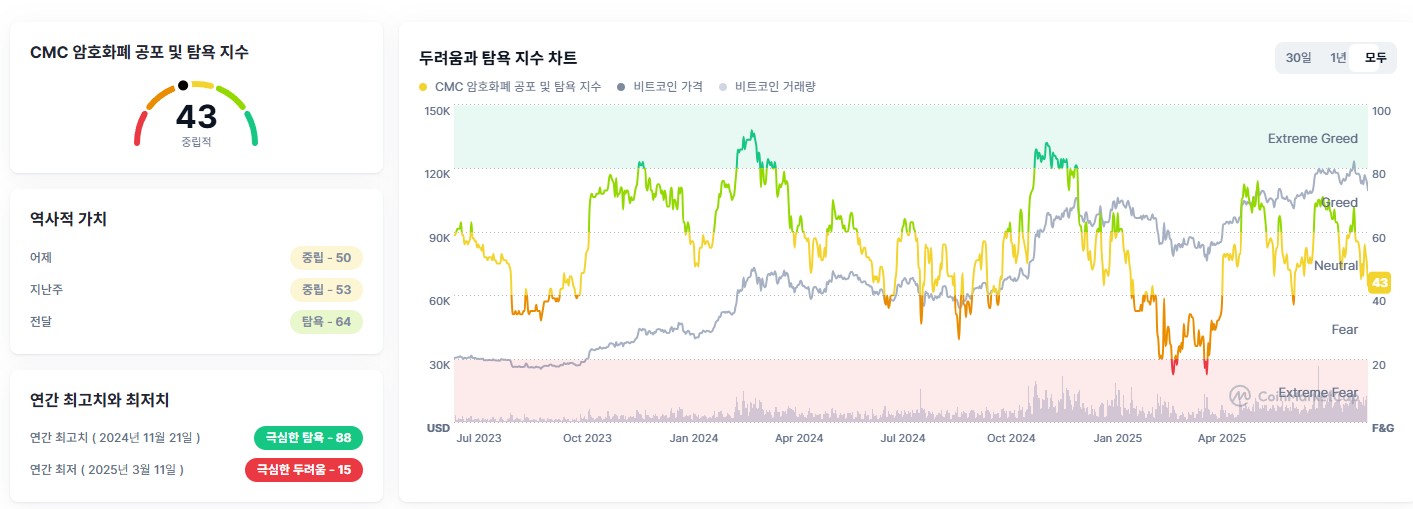 공포·탐욕지수 43은 중립 하단으로 과열이 낮은 상태입니다. 국내 프리미엄은 플러스권 유지로, 반등 시 동조화 가능성이 살아 있습니다.