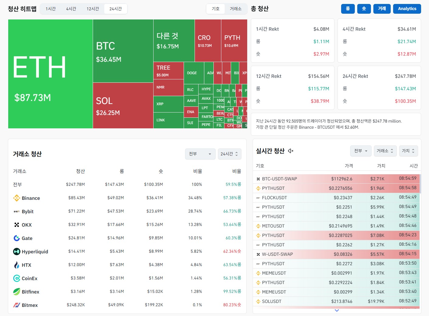 최근 24시간 청산 규모는 총 2억 4,778만 달러이며, 롱 포지션 1억 4,743만 달러, 숏 포지션 1억 달러가 청산되었습니다. 이는 숏보다 롱 청산 규모가 컸던 직전과 달리 숏 청산이 동반되며 반등 모멘텀을 강화시키는 구조입니다.