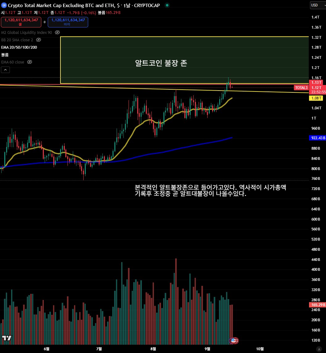 토탈3: 1.12T 돌파, 알트 불장 존 진입. 대세 상승 가능성 높음.