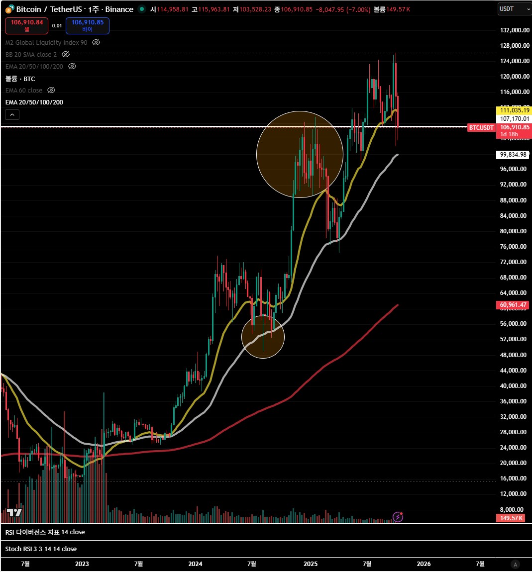 - 주봉 50주선(≈100K) 테스트는 강한 매수 대기가 누적될 구간.