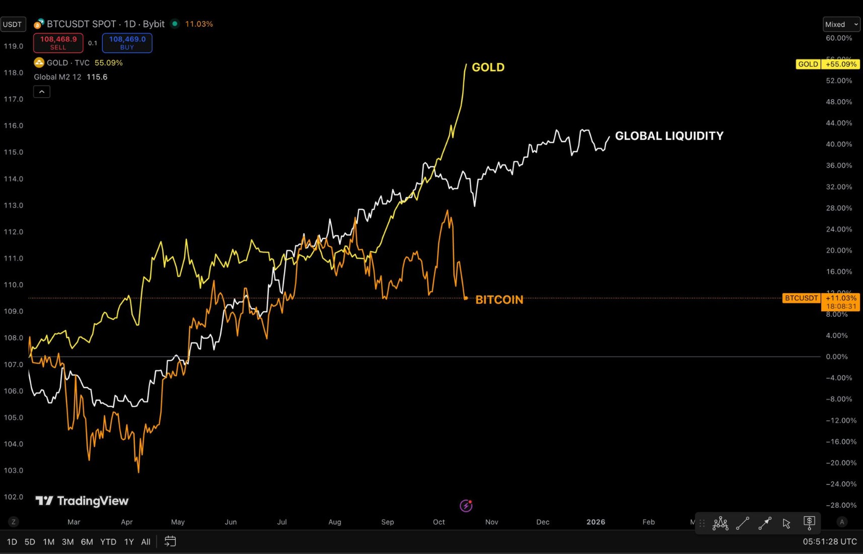 금이 먼저 뛰었다… 다음은 BTC: ‘M2 유동성 랠리’ 시작 신호