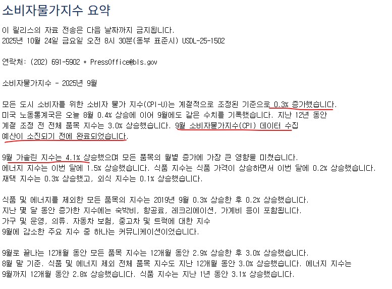 9월 CPI는 3.0%로 발표되어 예상치 3.1%를 하회했습니다. 헤드라인 둔화가 확인되었고, 근원 지표도 컨센서스 대비 다소 완화 방향입니다. 다만 에너지·서비스 하위 항목에서는 변동성이 여전히 관찰됩니다.