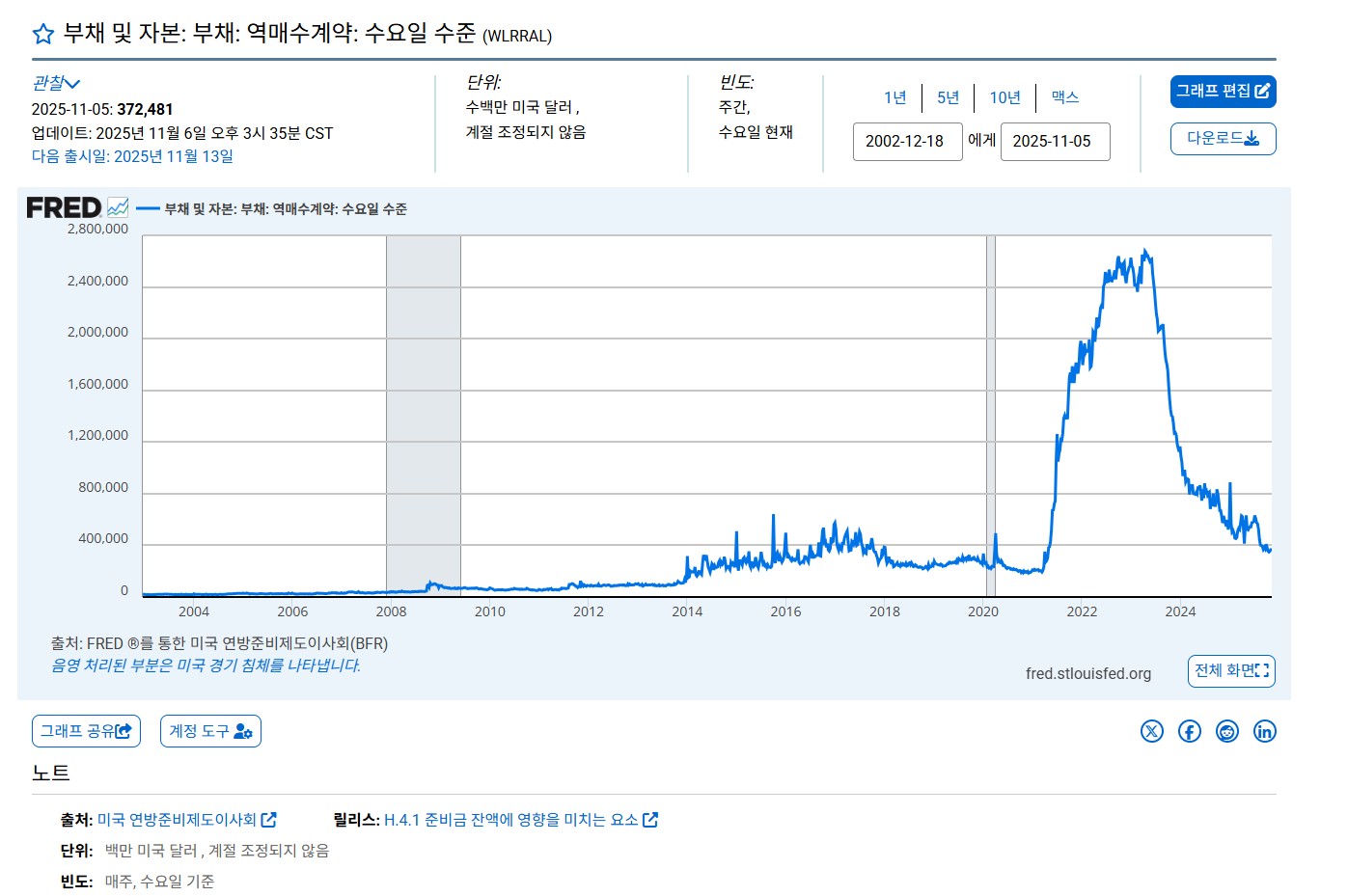 RRP(역레포) — 단기자금이 연준에 머무는 규모. 감소 지속이면 유동성 완화 신호.