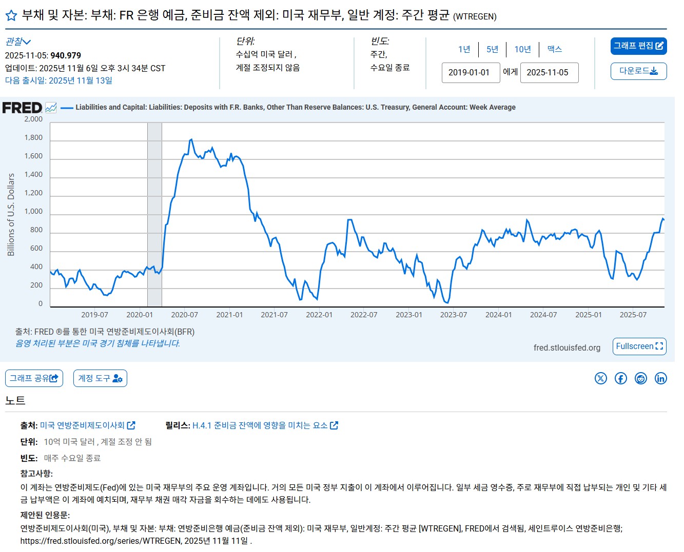 TGA(재무부 일반계정) — 재무부의 금고. 완만한 횡보/완화가 이상적, 급증은 흡수.