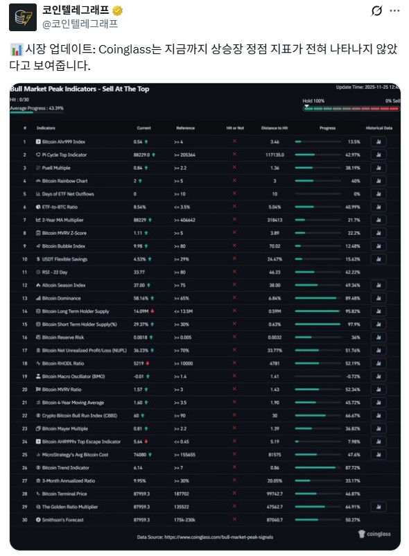 코인텔레그래프·코인글래스 기준 온체인 데이터는 이번 사이클이 아직 전형적인 정점 구간에 도달하지 않았다고 말하고 있습니다.