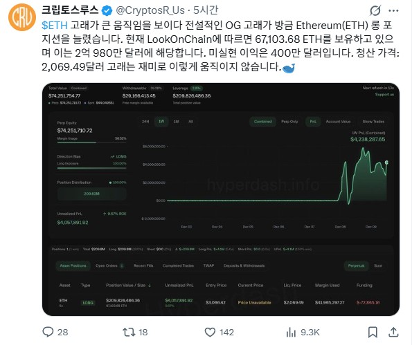 온체인 분석 계정 룩온체인에 따르면, 오래전부터 이더리움을 매집해 온 전설적인 고래 한 명이 최근 롱 포지션을 추가했습니다.