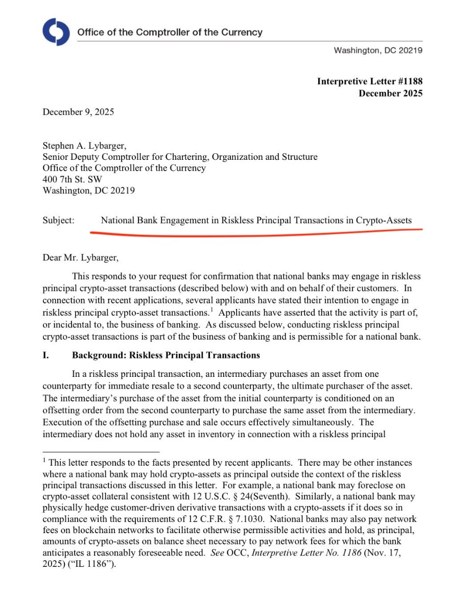 2. 미국 은행권, ‘무위험 암호화폐 직접 거래’ 공식 허용 레터