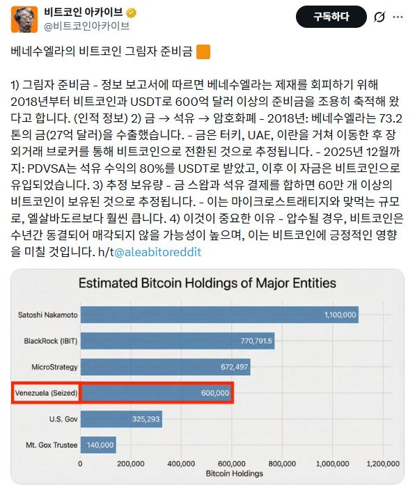 일부 분석에서는 베네수엘라가 상당한 규모의 비트코인을 보유하고 있을 가능성이 거론되고 있습니다.
