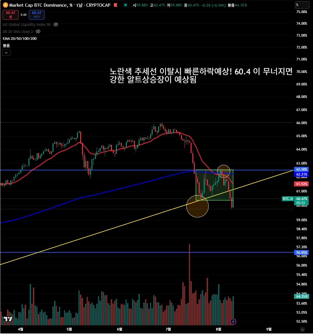 BTC 도미넌스는 현재 **60.47%**로, 노란색 추세선을 하향 이탈하며 알트코인 시장으로의 자금 이동 가능성을 시사하고 있습니다.