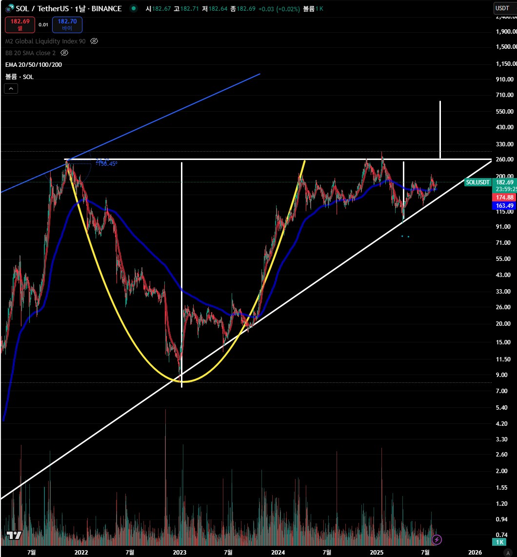 SOL 가격은 **$182.70 (약 25만 600원)**이며, 장기 컵앤핸들 패턴의 넥라인 돌파를 시도 중입니다.