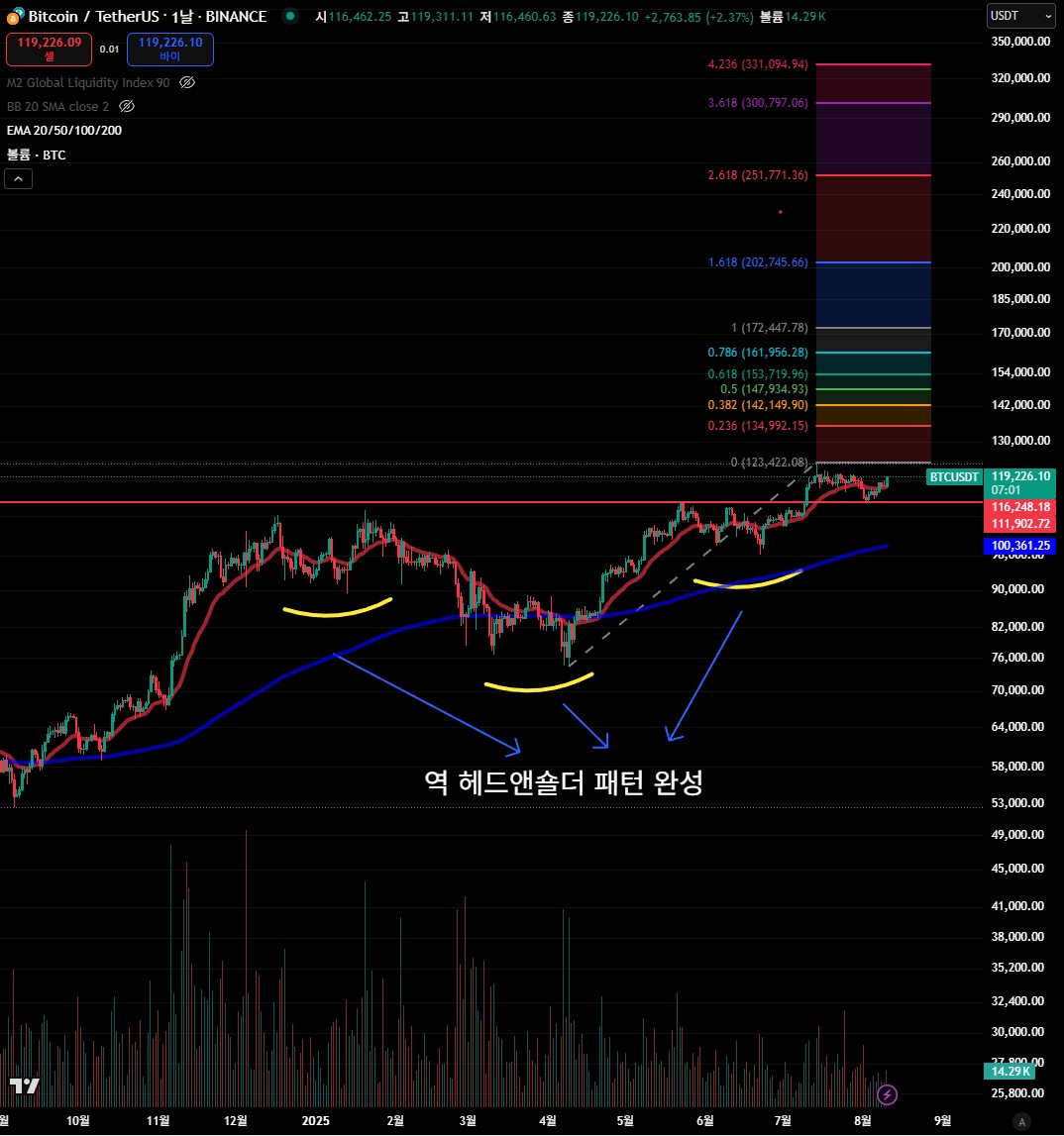 현재 비트코인 가격은 $119,226 (약 1억 6,389만 원) 수준으로, 최근 역 헤드앤숄더 패턴 완성 이후 박스권 상단 돌파를 시도하고 있습니다.