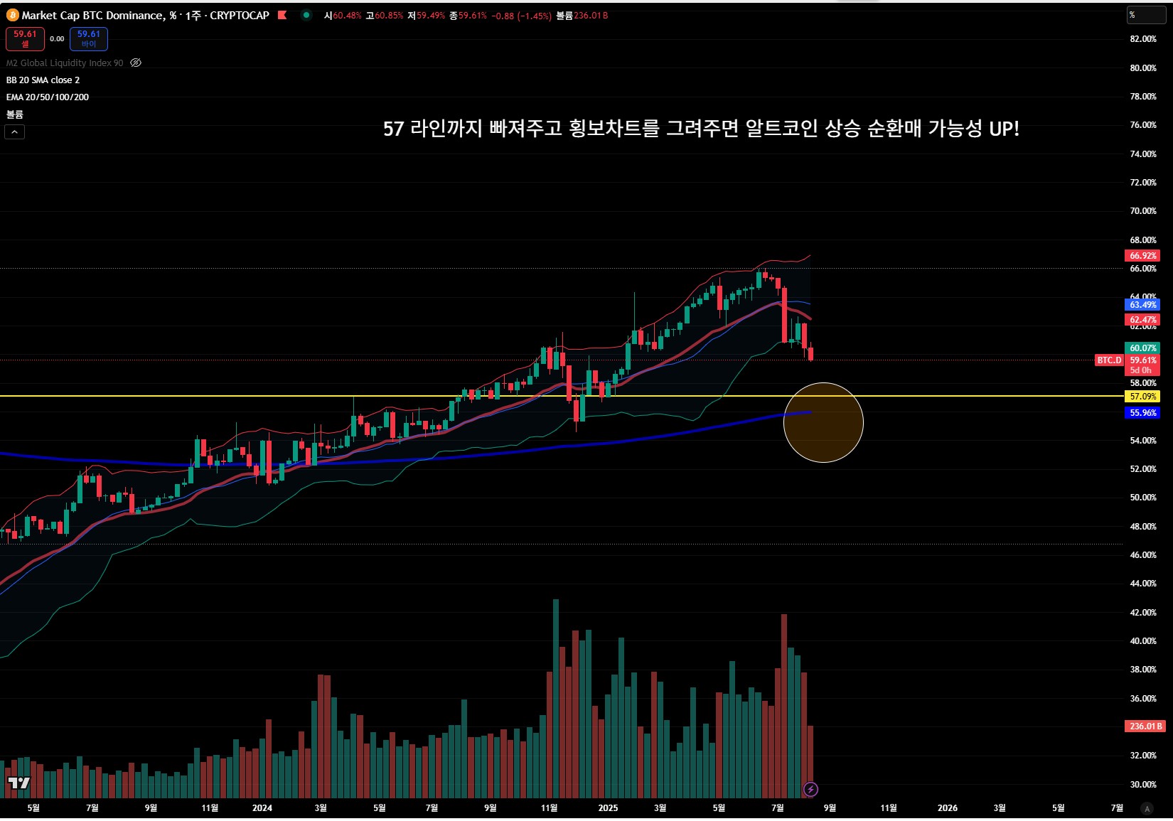 - 59%대로 빠지면 알트 동시다발 랠리가 촉발되기 쉬움. 반대로 61% 재안착 시 선별장세.