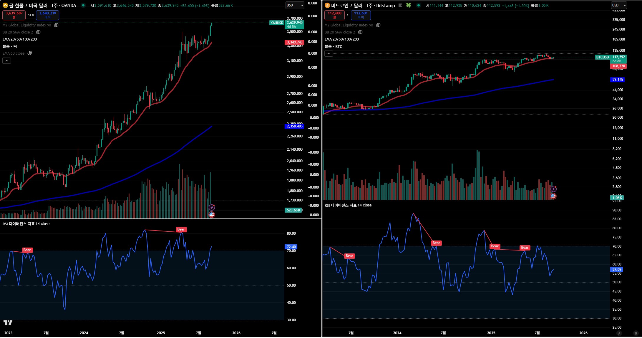 - 금(골드): 신고가 갱신 흐름 지속. 과거 사이클에서 금 선행→BTC 후행 전이 반복 관찰.