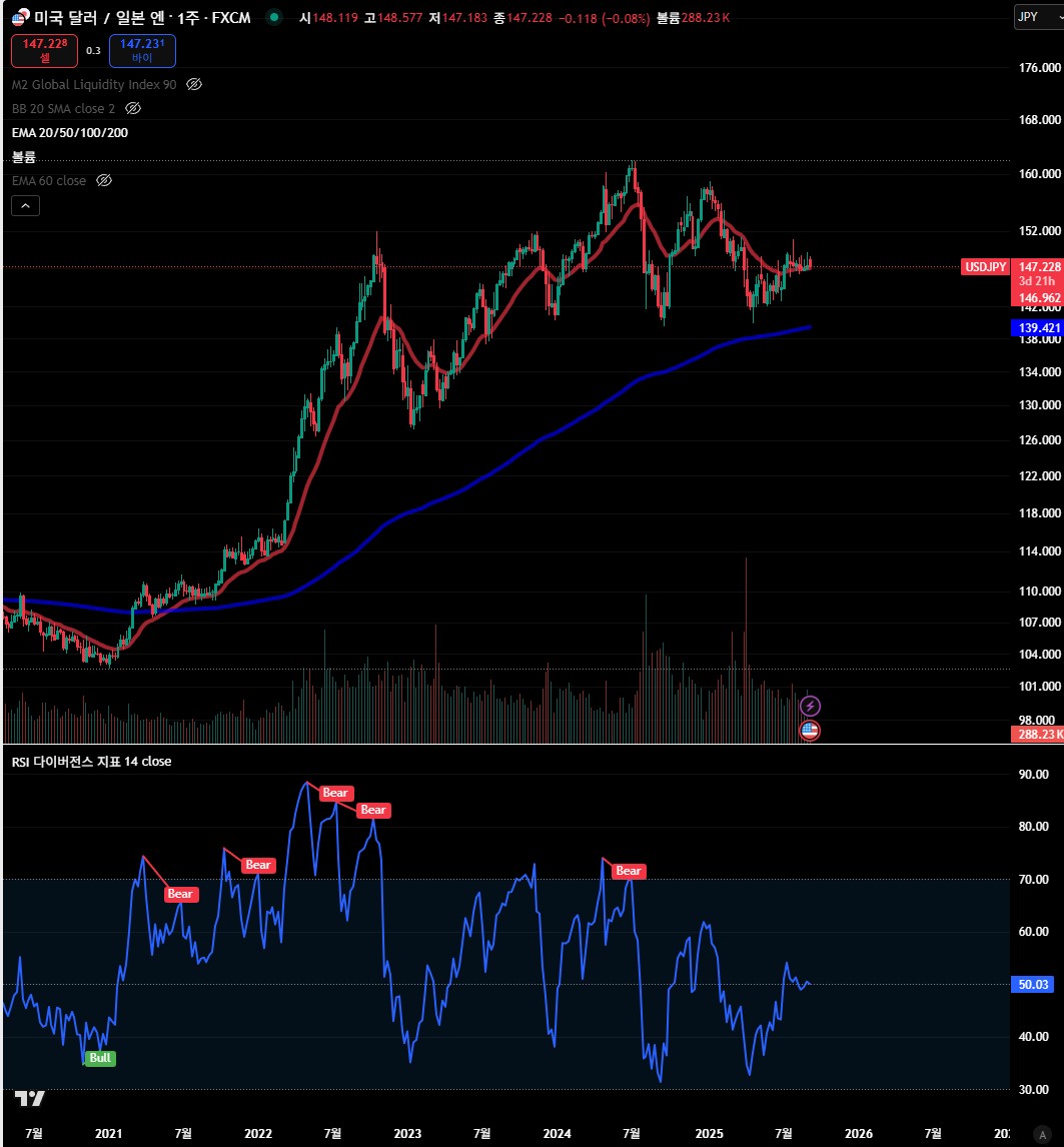 미국은 9월 금리 인하가 유력하게 거론되고 있으며, 유럽(ECB/BOE)은 상대적으로 관망 또는 지연 스탠스를 유지 중입니다. DXY는 유로/파운드 비중이 크므로, 유럽 통화의 상대 강세가 유지되면 DXY 약세가 가능하고, 이는 알트 시즌에 우호적입니다.