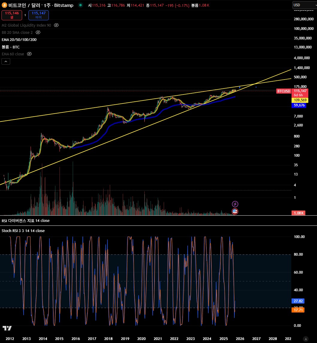 비트코인은 매 사이클마다 조정 기간이 짧아지고 있습니다. 이번 사이클 역시 삼각수렴(웨지 패턴)이 형성되어 있으며, 10월~11월 사이 분출 구간에 진입할 가능성이 높습니다.