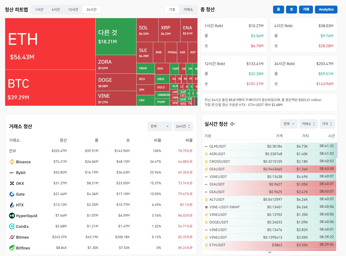 📉 총 청산 규모 (24시간): $203.47M