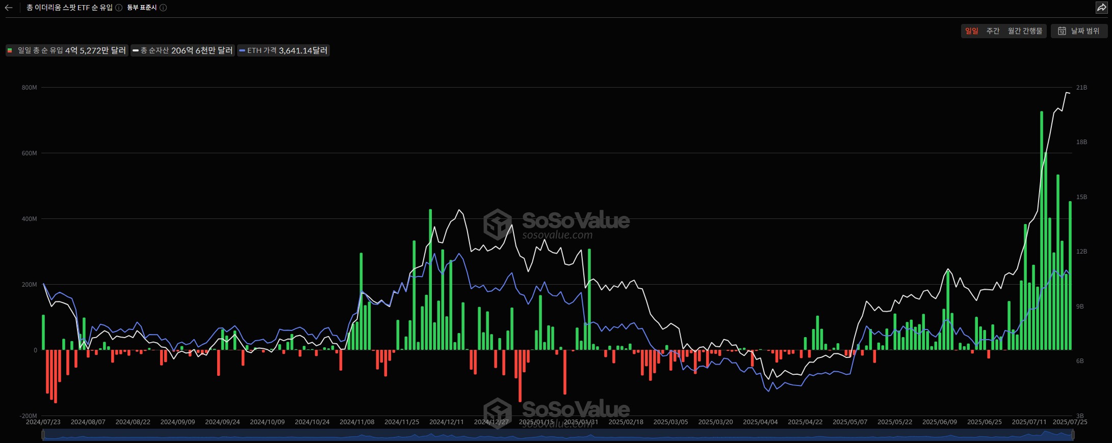 - 이더리움은 ETF 승인 후 강력한 자금 유입 지속, 강한 상승 모멘텀 확보