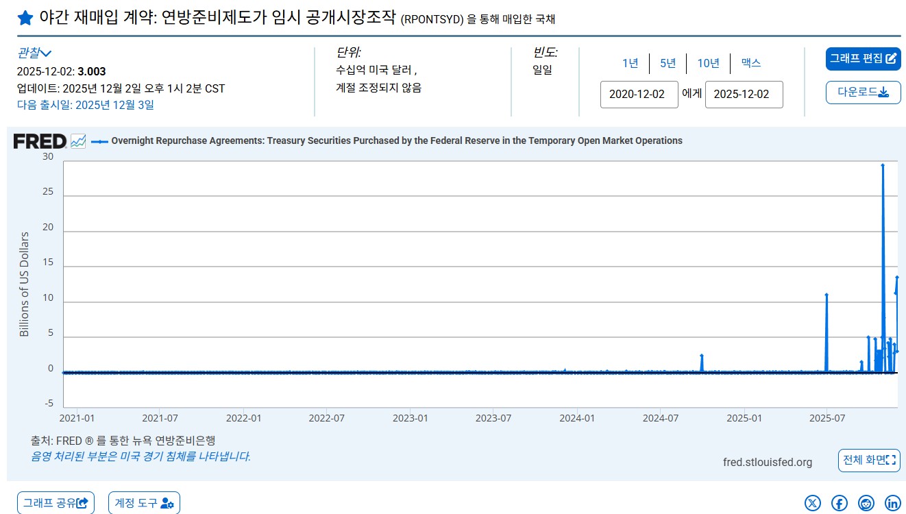 레포(REPO)는 은행들이 하루짜리 단기자금을 빌리는 야간 재매입 계약입니다. 시장에 유동성이 부족해지면 레포 금리가 급등하고, 연준이 대규모 레포를 집행하면서 응급 처치를 하게 됩니다.