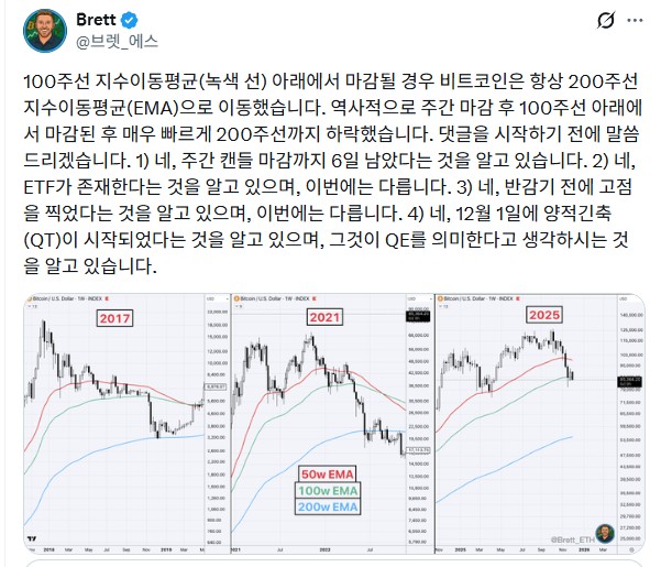 - 과거 2017년, 2021년 사이클에서 비트코인은 주봉 100주 이동평균선을 깨고 결국 200주 이동평균선까지 내려와야 바닥이었다.
