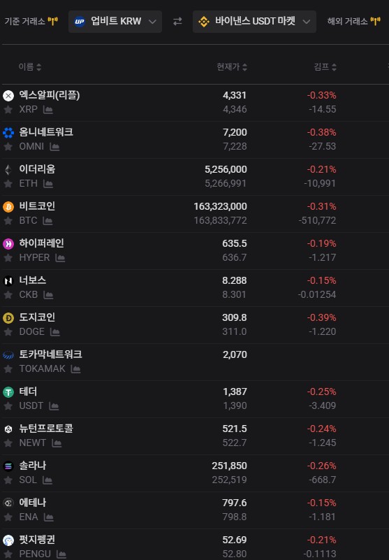 - 김치프리미엄: 업비트·바이낸스 비교 기준