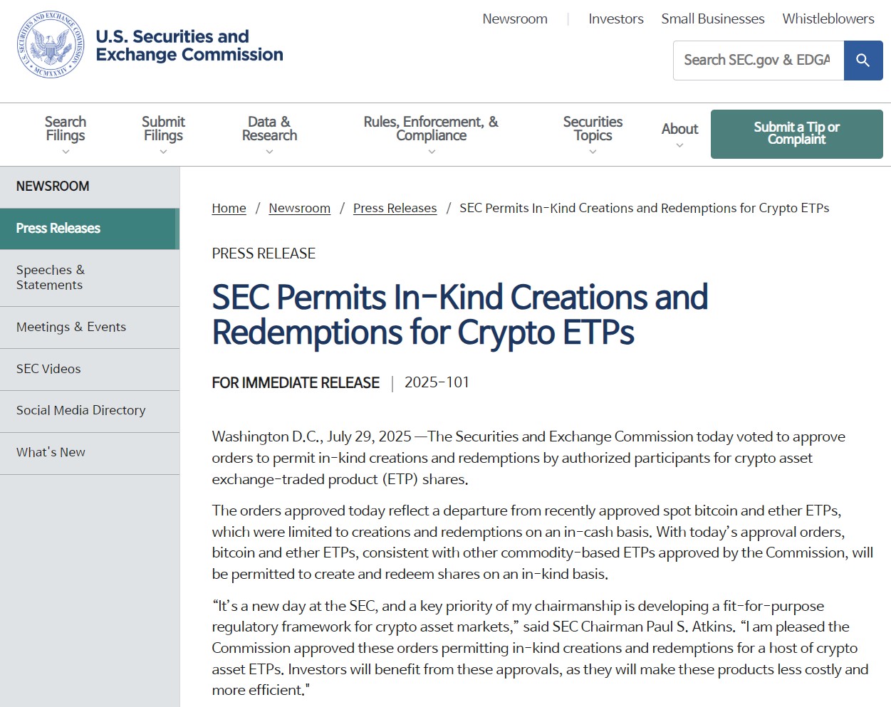 - SEC, BTC/ETH ETF에 대해 in-kind redemption(현물 상환) 허용 발표